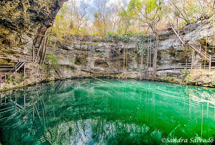 В паре километров от основной пирамиды города Черного Ягуара расположен магический сенот Шканче. На велосипеде, рикше или просто пешком, по исторической дороге сакбе, мы попадаем в это изумительное место. Сенот сохранил первозданный вид, были только добавлены деревянные помосты, тарзанка и лестница для спуска, опять же максимально интегрированные в общий вид озера. Дорога сакбе и сенот принадлежит общине майя, которая старается максимально сохранить природный объект.